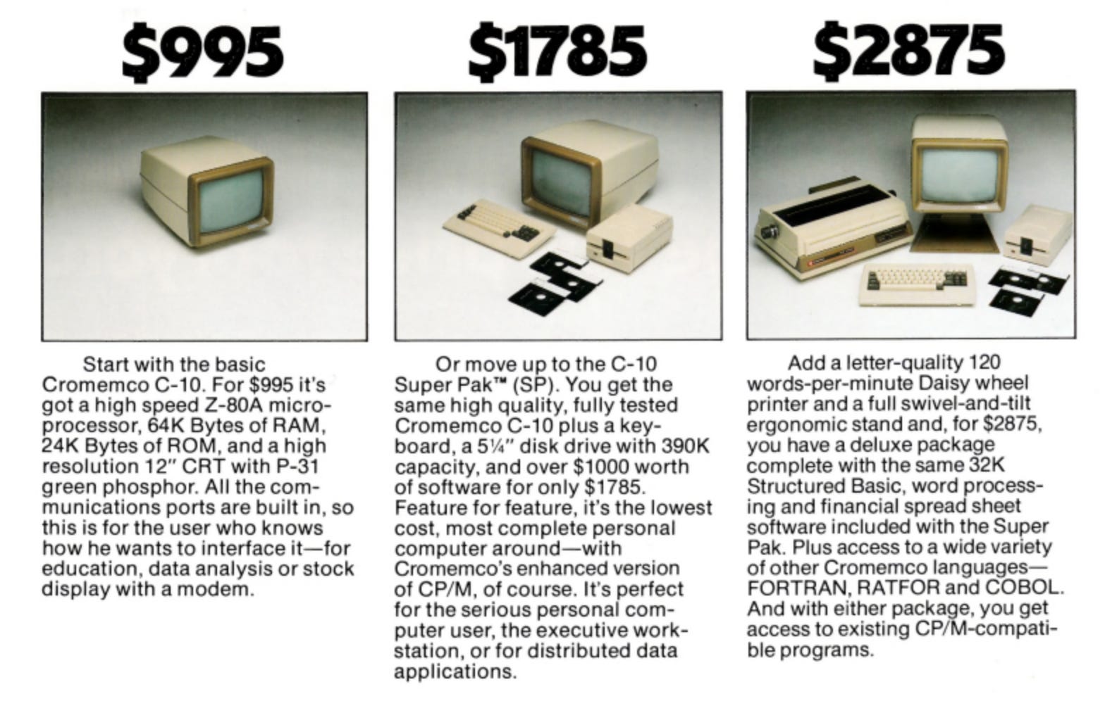 For an extra $1,000, users would also get a Daisy wheel printer, an ergonomic stand, and “access to a wide variety of other Cromemco languages—FORTRAN, RATFOR and COBOL”.